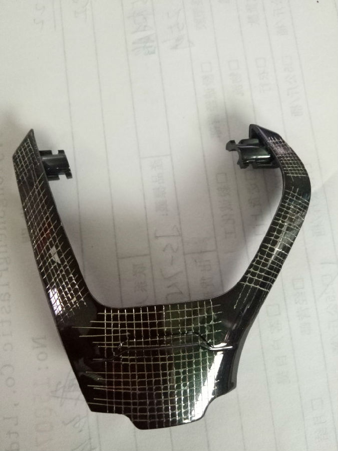 2.真空鍍層表面噴硬度高的UV,UV面漆太硬也會(huì)出現(xiàn)附著不理想的情況,容易出現(xiàn)劃百格崩刀口,局部掉漆等情況,如果先噴鍍層處理劑再噴面UV的話就可以保證劃百格刀口的連慣性,劃起來面漆不容易脆,有比較好的韌性。